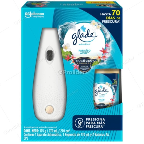 El ambientador Glade Paraíso Azul mantiene mi oficina con un aroma fresco y duradero. Fácil de usar y muy práctico. ¡Recomendado!
